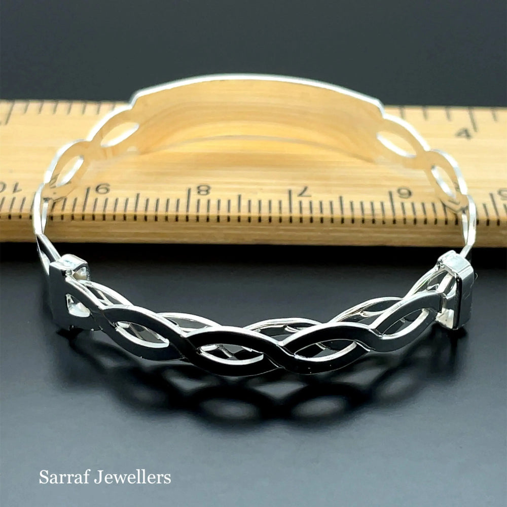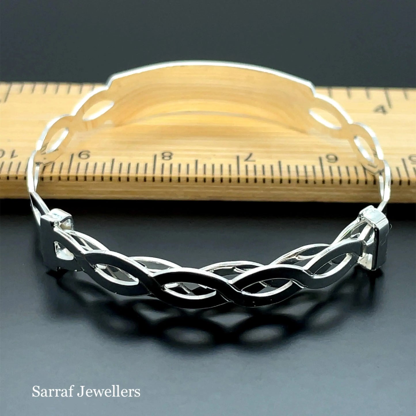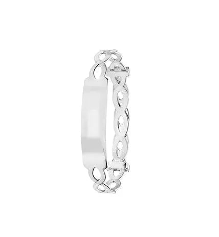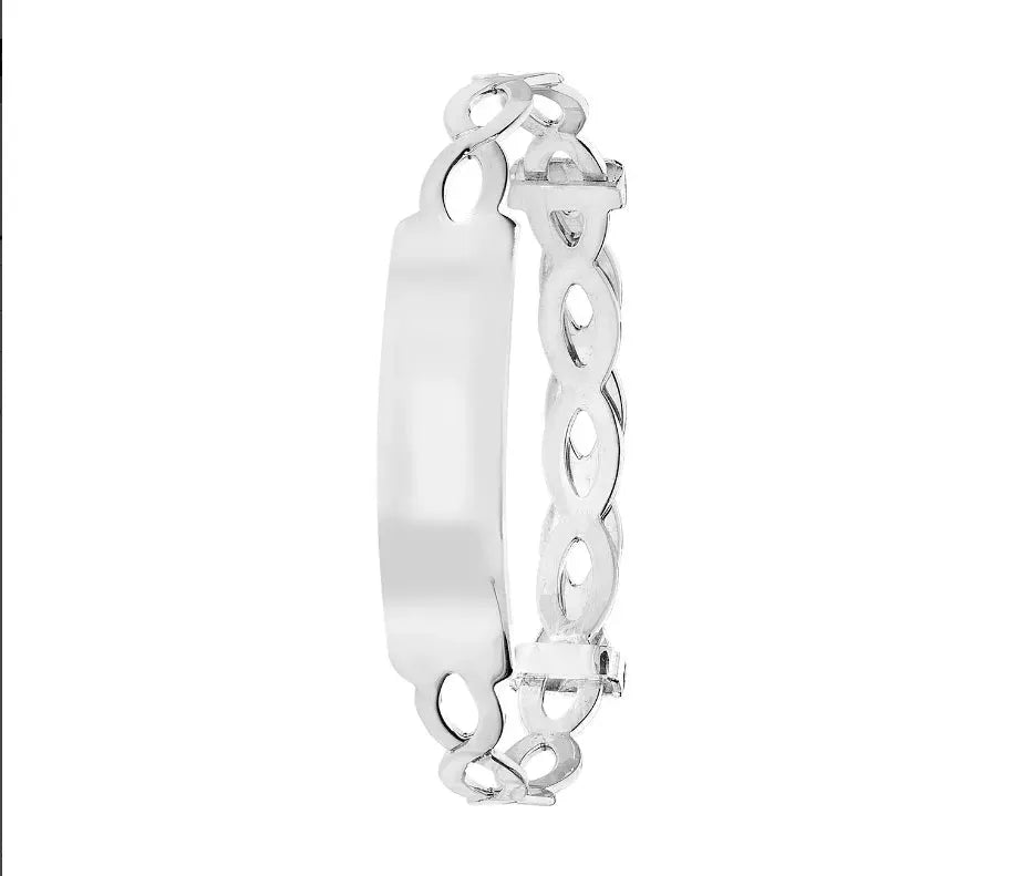 Celebrate your child’s precious milestones with the Silver Baby ID Bangle featuring a graceful Infinity design. This beautifully crafted sterling silver bracelet blends meaningful symbolism with classic style, making it an ideal gift and keepsake. Designed with an expandable structure and an engraving-ready ID plate, it offers both form and function for growing little ones.